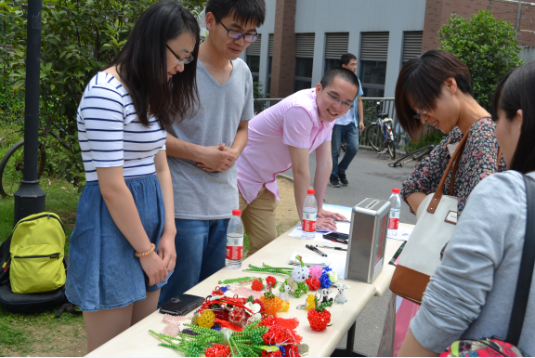 义卖活动在中午开始,10点半的时候,志愿者们已经在布置场地,摆设各式各样的手工艺品,在路边邀请同学们前去挑选。11点半,同学们逐渐多了起来,围在义卖棚边挑选自己喜欢的手工艺品,积极地伸出援手、奉献爱心。