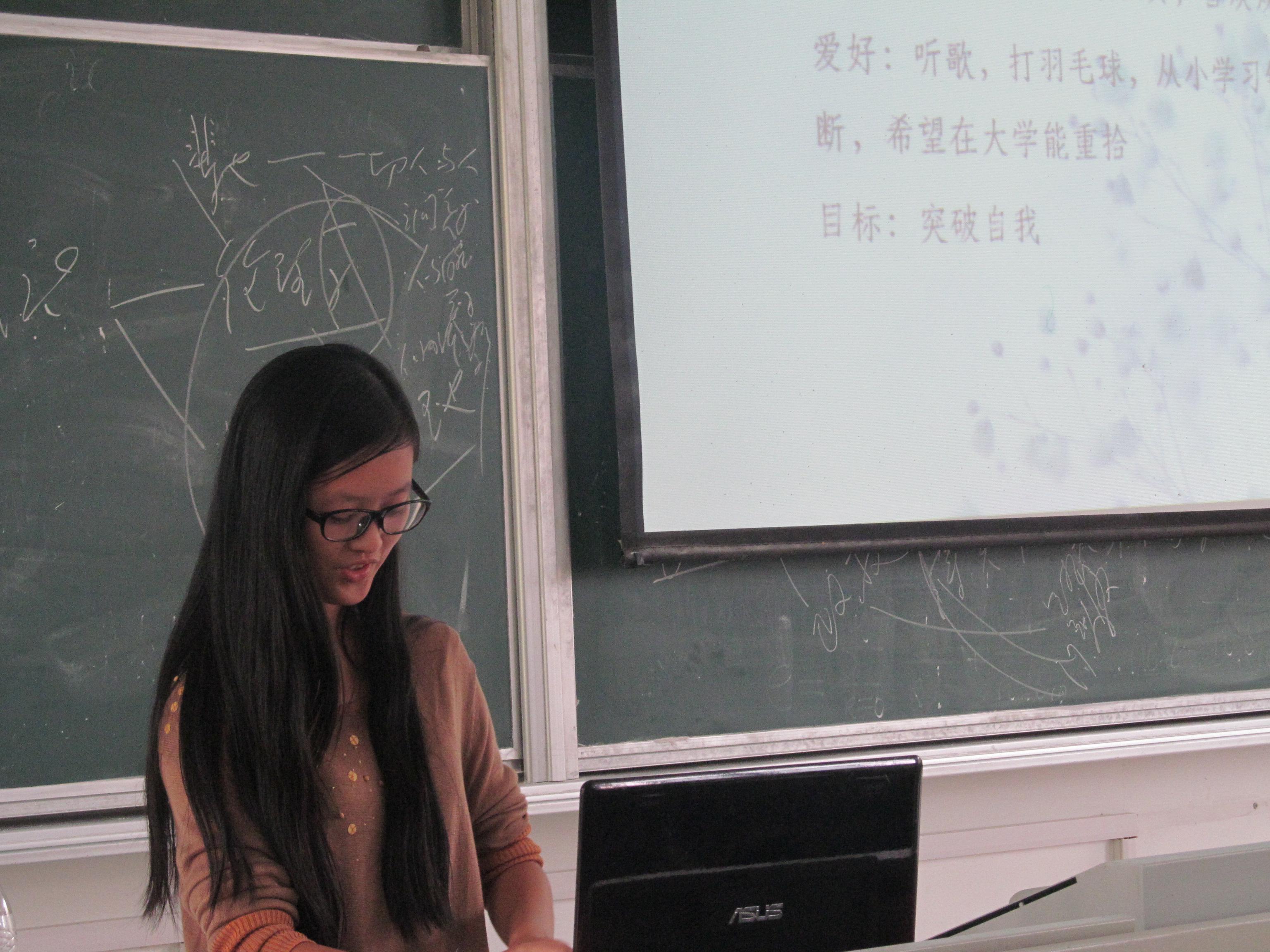 随后,副班长童谣同学上台以PPT的形式展示了她精心为班级全体成员制作的个人名片。单调的自述文字因绚丽的背景与配图而夺人眼球,班会也因此迎来了小高潮。这种配有个人照片的侧重每个同学性格、特长的介绍,有利于同学们之间的深入了解,并在一定程度上明晰和增添了每一位同学的人格魅力,从个人向集体,提升了整个班级的集体自豪感。