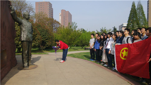同学们首先到达贝时璋像前,班长带头进行献花,然后同学们行注目礼进行缅怀。