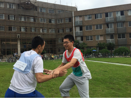 分组完成后正式进入撕名牌环节,本环节由一班团支书黄承磊同学担任裁判。随着他的一声令下,万众期待的撕名牌开始了。红队较为主动,刚开始便气势汹汹地压了上来,蓝队同学相对保守,连连后退,等候时机。很快,混战一触即发。现场乱作一团,同学们三五成群,一轮下来,蓝队一名同学惨遭淘汰。休息片刻,第二轮混战开始,蓝队又失一员。面对劣势,蓝队非但没有气馁,反而更加努力,成功力挽狂澜。最终决战,蓝队2人,红队1人,其余同学纷纷在场外观看,期待着冠军队的诞生。经过激烈的比拼,蓝队夺得了胜利,上演了一场逆袭的好戏。