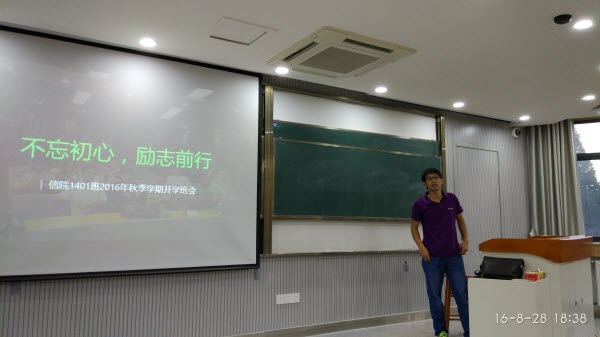 8月28日,信院14级1班召开新学期第一次班会,班会的主题是“不忘初心,励志前行”,旨在提醒同学们要牢记心中的信念,不忘过去,展望未来。同时全班同学重温班训”心怀梦想,团结友爱,炫彩青春,全面发展“的内涵,以此促进自己不断进步。