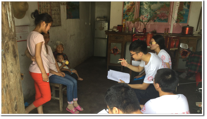 下午2点30分,午休过后,按照计划,分六组到各自然村走访部分村民家庭,了解当地的留守儿童以及学龄前儿童的受教育问题。在走访之中,我们观察到很多家庭都是爷爷奶奶照看孩子,这些孩子中,有些活泼开朗,和志愿者们相谈甚欢,但有些孩子比较腼腆,不愿意过多的与志愿者们交流,在志愿者的热情感染下,孩子们最终也敞开心扉,让我们了解到孩子许多的生活故事