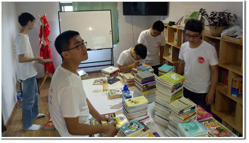 在一部分志愿者走访同时,还有几名同学讲募捐到的图书以及原有的图书编号整理。