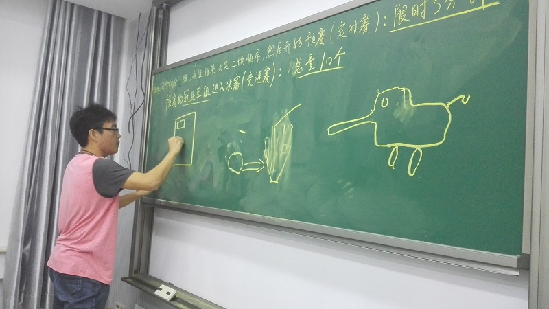 晚上7点,活动开始。主持人上台宣读“你画我猜”活动的游戏规则:游戏会将同学们分为两组,由组内每一个人上黑板轮流进行画画,剩下的组内成员负责猜测图画内容,比赛计时每个组答出10道题所用时间,用时最短的获胜。