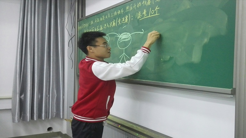 于是,主持人在同学们的欢呼声中按下秒表,示意比赛开始。第一组的同学派出任泓宇出战,他得到了“土豆、计算器、混沌”等10个词语,那该如何表达呢?在一番冥思苦想后,他依次在黑板上画出了自己的理解。计算器就直接画个带键盘和显示屏的机器,土豆就是一个块状物变成一桶爆米花,混沌就直接就是一个飘着东西热气腾腾的碗了。他构思巧妙,将这些词语尽可能用同学们能理解的方式具象化出来,让人眼前一亮。