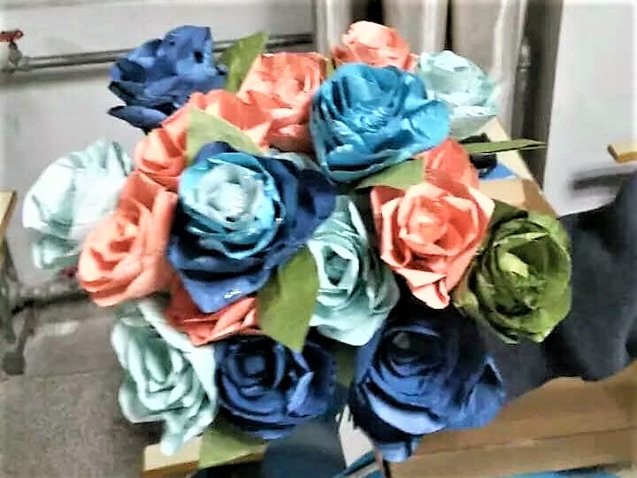活动现场的折花工作有条不紊的进行着,玫瑰组的同学采用流水线作业,一会就完成了许多花枝、花瓣的工作,在同学们灵巧的双手中变出一朵又一朵美丽的花。满天星组则采用集体讨论、共同制作的方式,桌上一会儿工夫就摆满了花……整个教室里热闹非凡,洋溢着欢声笑语。
