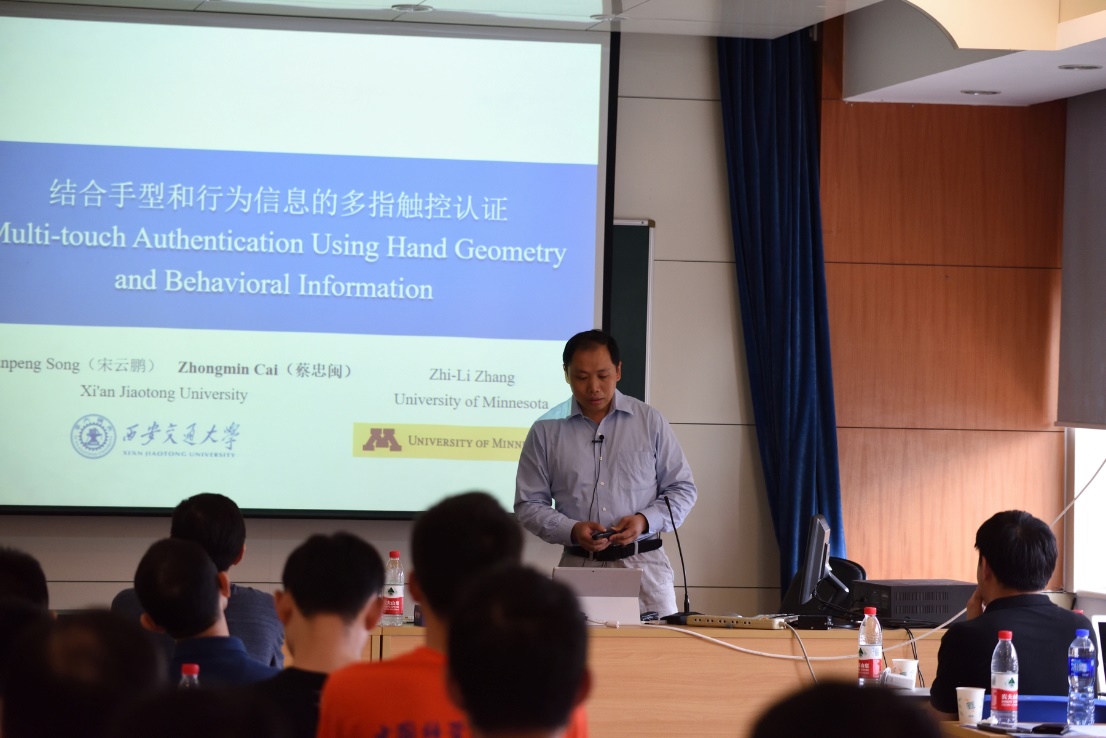 西安交通大学的蔡忠闽教授作了主题为《结合手型和行为信息的多指触控认证》的报告。该工作也发表在2017年的IEEE Symposium on Security and Privacy会议中,他们基于目前手机、平板以及大量笔记本电脑等移动计算设备多配备多指触摸屏,报告介绍了一种利用多指触控设备进行用户身份认证的方法。