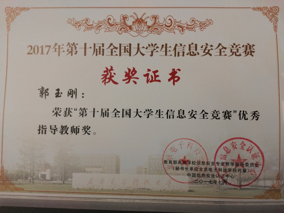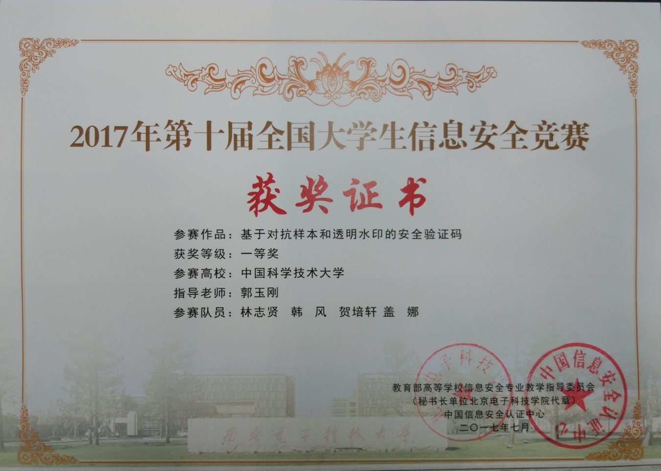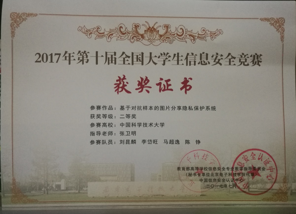 7月28日-30日,第十届全国大学生信息安全竞赛总决赛在西安电子科技大学举行,由信息KY.COM开元体育(中国)科技公司网络信息安全系指导的两个项目《基于对抗样本和透明水印的安全验证码》和《基于对抗样本的图片分享隐私保护系统》分别获得决赛一等奖、二等奖。中科大领队、项目指导老师郭玉刚被评为的大赛优秀指导教师。