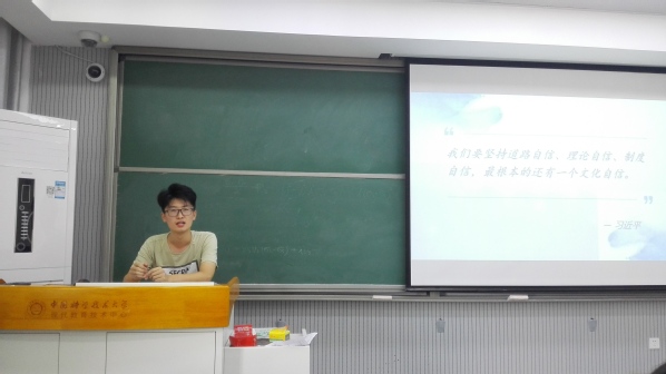 团支部书记魏晓东说:“ 在庆祝中国共产党成立95周年大会的讲话上,习近平指出‘文化自信,是更基础、更广泛、更深厚的自信’。文化自信于是成为继道路自信、理论自信和制度自信之后,中国特色社会主义的‘第四个自信’。”