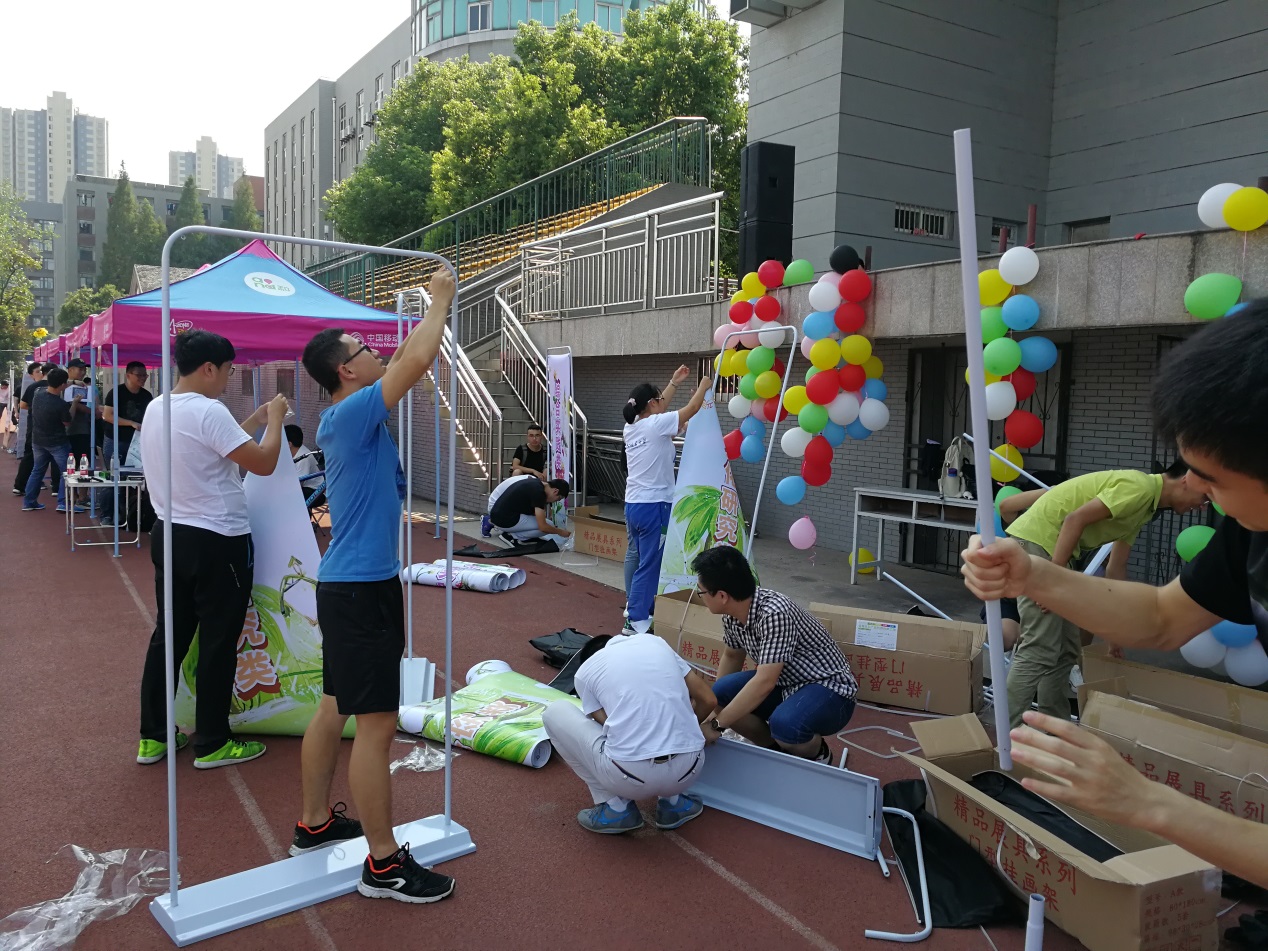 早上8点,负责上午工作的同学们从西区活动中心出发,在管指委同学的带领下,将20余张折叠桌由西区运往东区。同学们到达东区操场后,便开始了游园会准备工作。为了让各社团更加方便地进行活动,同时便于区分各社团,男同学们围绕操场开始搭帐篷。他们首先两两一组将帐篷运到操场的各个方位,再四人一组每个方位的帐篷按照要求撑开摆好,这看似简单的活动实则十分辛苦,男同学们顶着烈日积极工作着,没有半点怨言。与此同时,女同学们被派到体育教学楼吹气球,以备下午使用。转眼间已近正午,望着操场上整齐的帐篷和体教里吹好的气球,同学们都露出了欣慰的笑容。