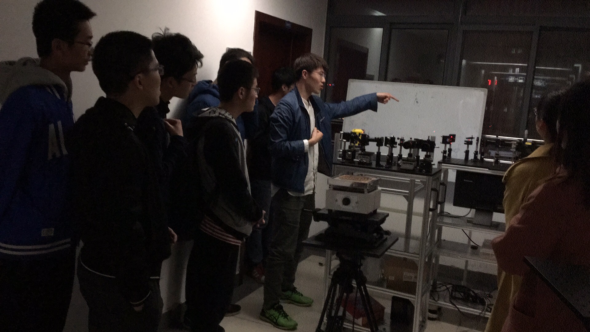 4月15日晚上,参与同学在信院大楼门口集合,19:30在工作人员的引领下到科技实验西楼参加了光波实验室的讲座,之后在老师的带领下对该实验室进行了参观,并由实验室师兄师姐现场演示了光学实验。
