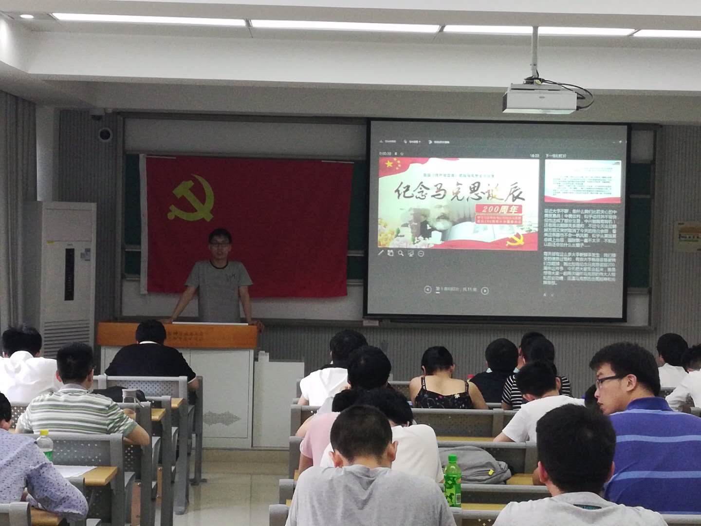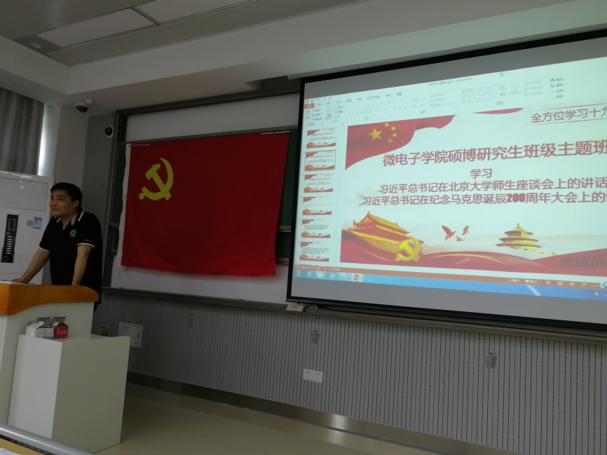 这次会议首先由16级微电子KY.COM开元体育(中国)科技公司硕士班班主任郑重老师上台发表了讲话,给大家先详细的介绍了此次主题班会的主题,强调了此次会议是与以往党支部学习会议不同,这一次是正好凭借主题班会的召开,让班级成员和党员之间有更加密切的交流,让班级成员了解党支部的学习模式,同时让党员以自己亲身体会来向班级所有成员传达对党的深刻的认识。接下来便是由微电子KY.COM开元体育(中国)科技公司16级硕士班班长以PPT的形式向大家介绍习近平总书记在北京大学师生座谈会上的讲话和习近平总书记在纪念马克思诞辰200周年大会上的讲话。