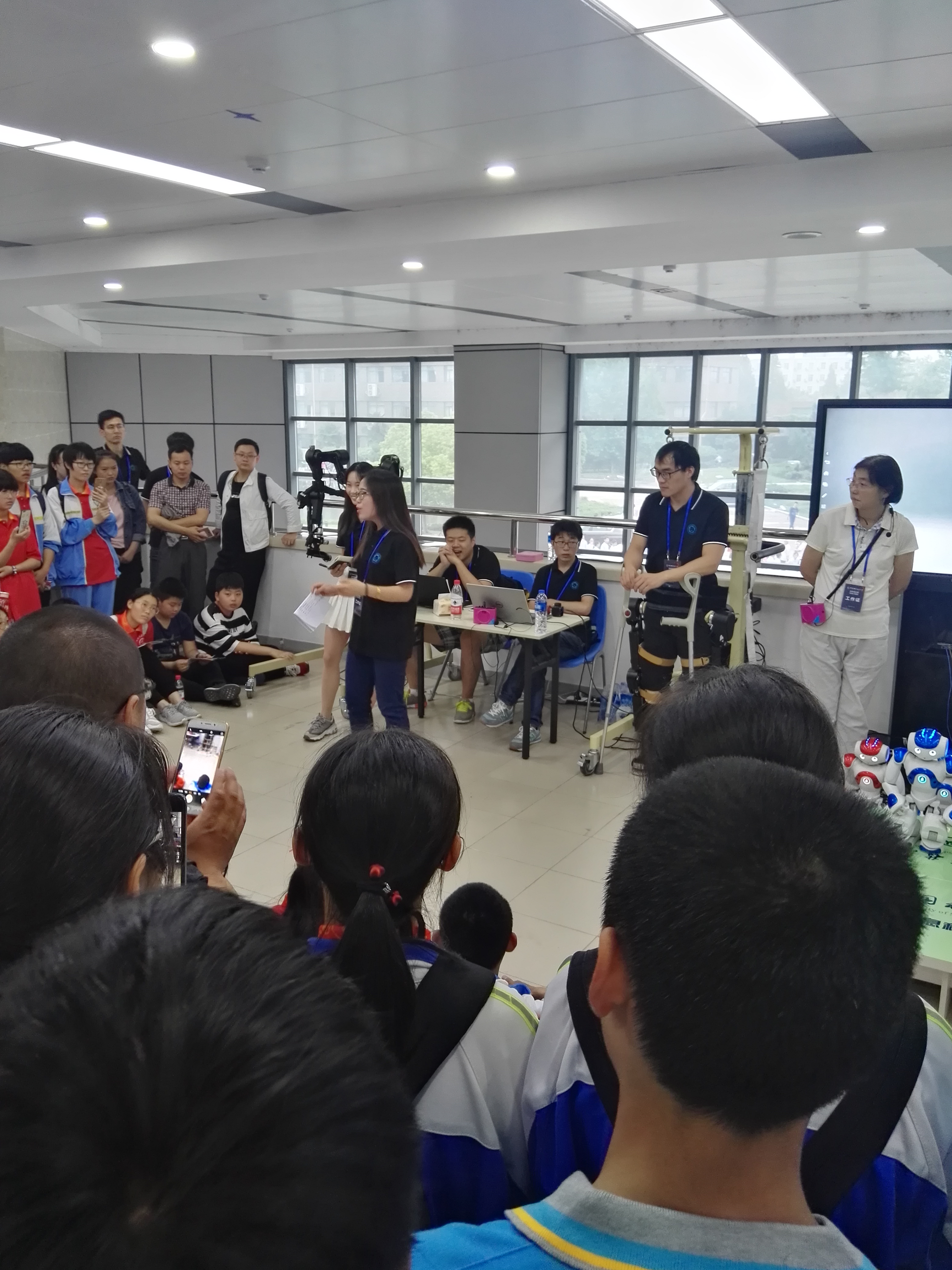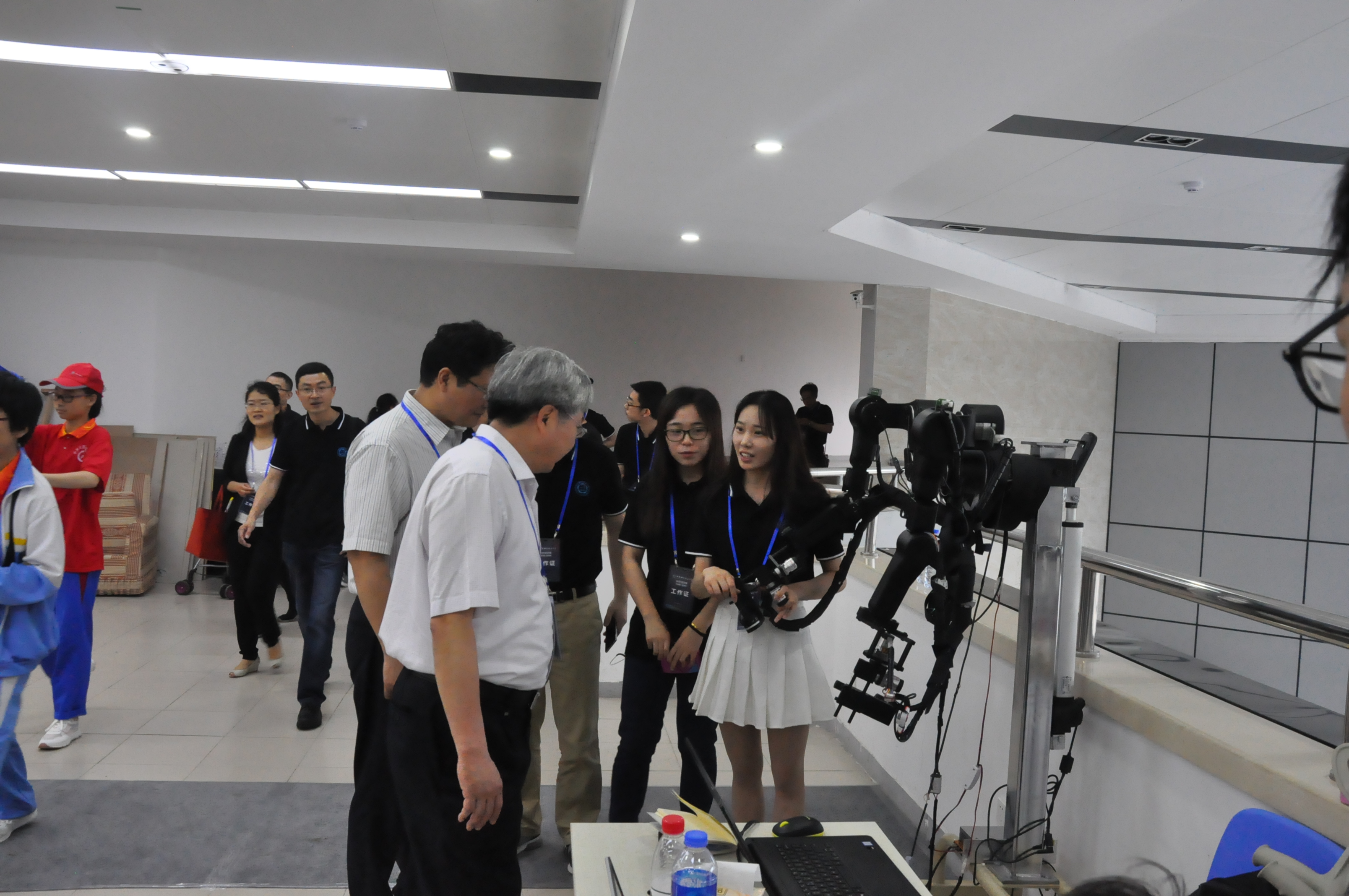 19日上午,副校长朱长飞、党委副书记蒋一在党政办、科研部、宣传部、校团委等部门负责人的陪同下,来到信息科普点了解活动组织情况,并详细了解上下肢外骨骼机器人和仿人智能机器人的准备情况。