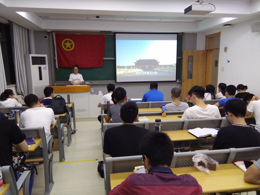 本次活动由团支书王立梅主持,首先她简要地向同学们介绍了习近平总书记在北大师生座谈会和纪念马克思诞辰200周年重要讲话的事件经过。接着,她带领同学们一同回顾了5月2日晚新闻联播中习近平总书记考察北大的影像。