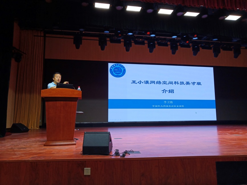 由李卫海老师为同学们介绍今年举办的王小谟网络空间科技英才班情况,该班宗旨在为国家培养培养具有扎实理论基础和卓越实践能力的网络空间安全领域科技人才,同时也就选拔办法,培养方式,教学计划为同学们进行了详细的解读和分析。