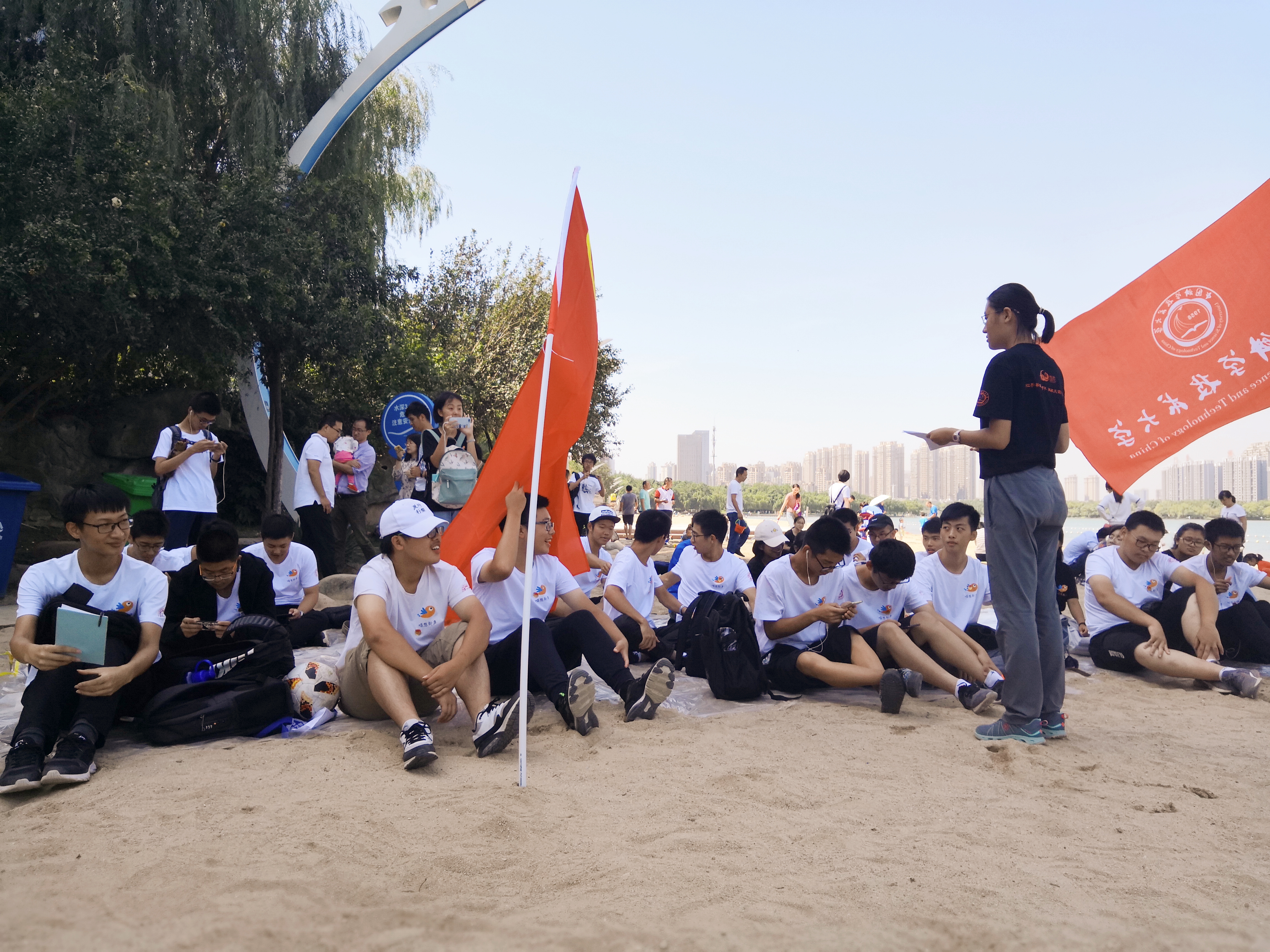 测向活动结束后,同学们在湖畔沙滩集合进行团课教育。在飘扬的团旗和校旗下,团支书赵明坤同学发表了题为《让青春与时代同心同向》的演讲报告。