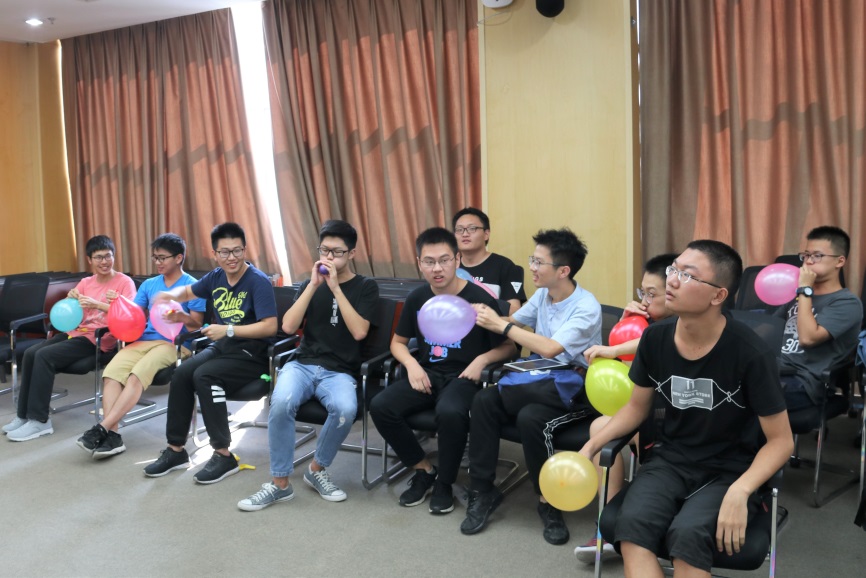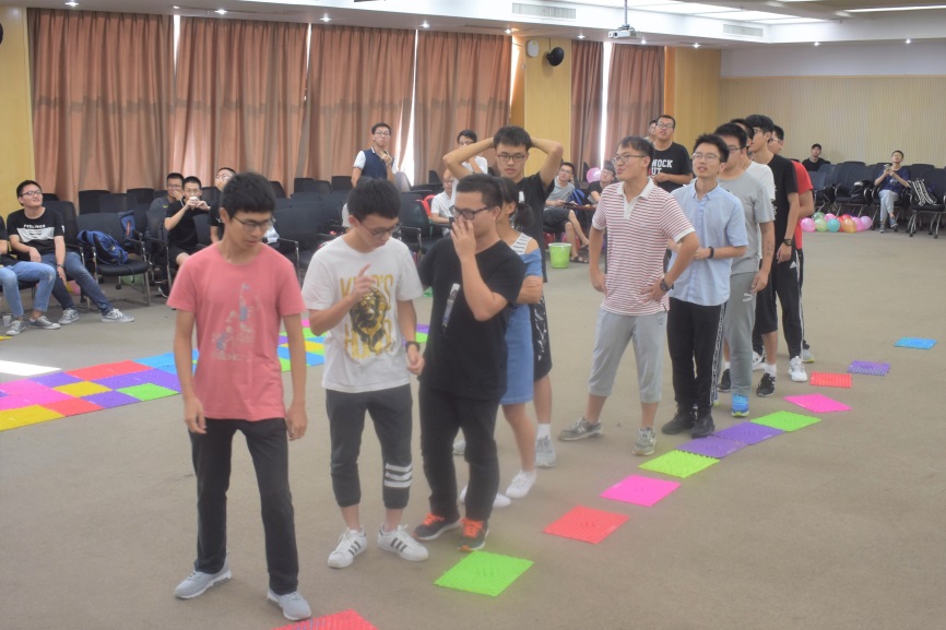迎新会由游戏“一元五角” 揭开帷幕。游戏规定男生代表“五角”,女生代表“一元”,主持人指定一个数额,参与者便要手牵手形成小组以凑出该数额,没有凑成指定数额的小组则被淘汰。简单的游戏规则调动了大家的积极性。游戏中大家五花八门的反应,让整个会场迅速升温。随后进行的 “你画我猜”、“夹气球跑”等游戏,也让大家在小组协作中逐渐熟络起来,关系更近一步。