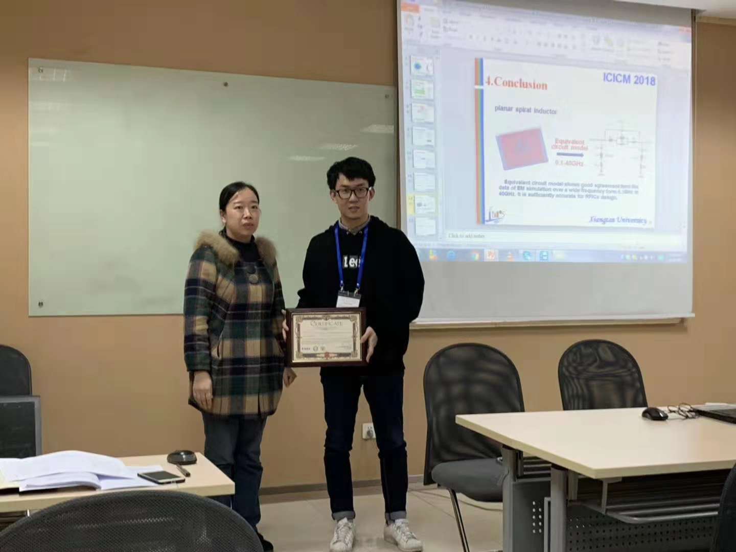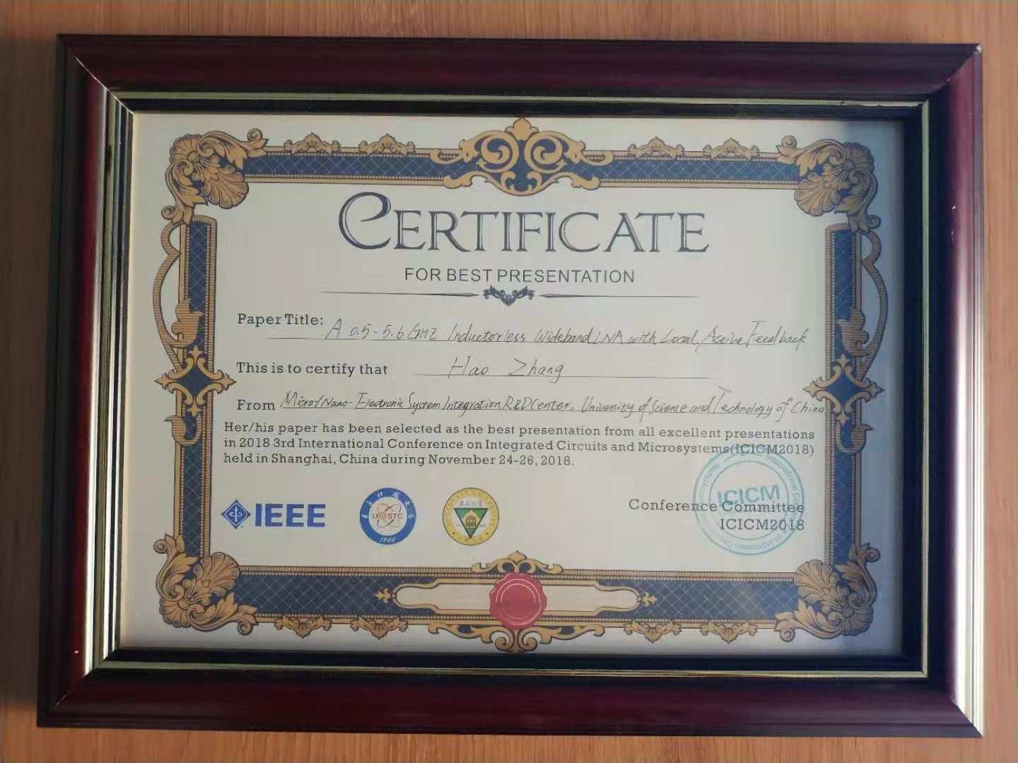 第三届集成电路与微系统国际会议(International Conference on Integrated Circuits and Microsystems,ICICM)于2018年11月24-26日在上海交通大学举行。本次会议由电子科技大学微电子与固体电子学会,东南大学联合承办。本次会议包含现代电子信息技术、电子电路与系统、功率电路与传输和通信工程应用等6个主题,来自北京大学、中国科学技术大学、日本弘前大学和加拿大瑞尔森大学以及中科院微电子所等国内外高校和研究机构的共48篇论文的作者在会议上作了报告,共同探讨交流了集成电路领域的研究进展和未来的发展方向。由中国科学技术大学微电子KY.COM开元体育(中国)科技公司微纳电子系统集成电路研究中心(MESIC)林福江教授指导的硕士研究生张昊、闫旭参会,二人所作的论文《A 0.5-5.6 GHz Inductorless Wideband LNA with Local Active Feedback》获得最佳展示奖。