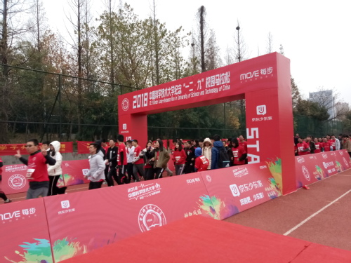2018年12月9日下午2点整,“一二九”校园马拉松在中国科学技术大学西区运动场上如期开幕。这一次的如期开幕因为一场小雪而显得略有特殊,略有恶劣的天气更加突显参赛队员的勇气与毅力。今年的马拉松活动旨在纪念一二九抗日救亡爱国运动,同时也意在鼓励同学们增强体魄,磨练毅力,培养领导力和学术能力。中国科学技术大学校党委副书记蒋一出席并致辞。