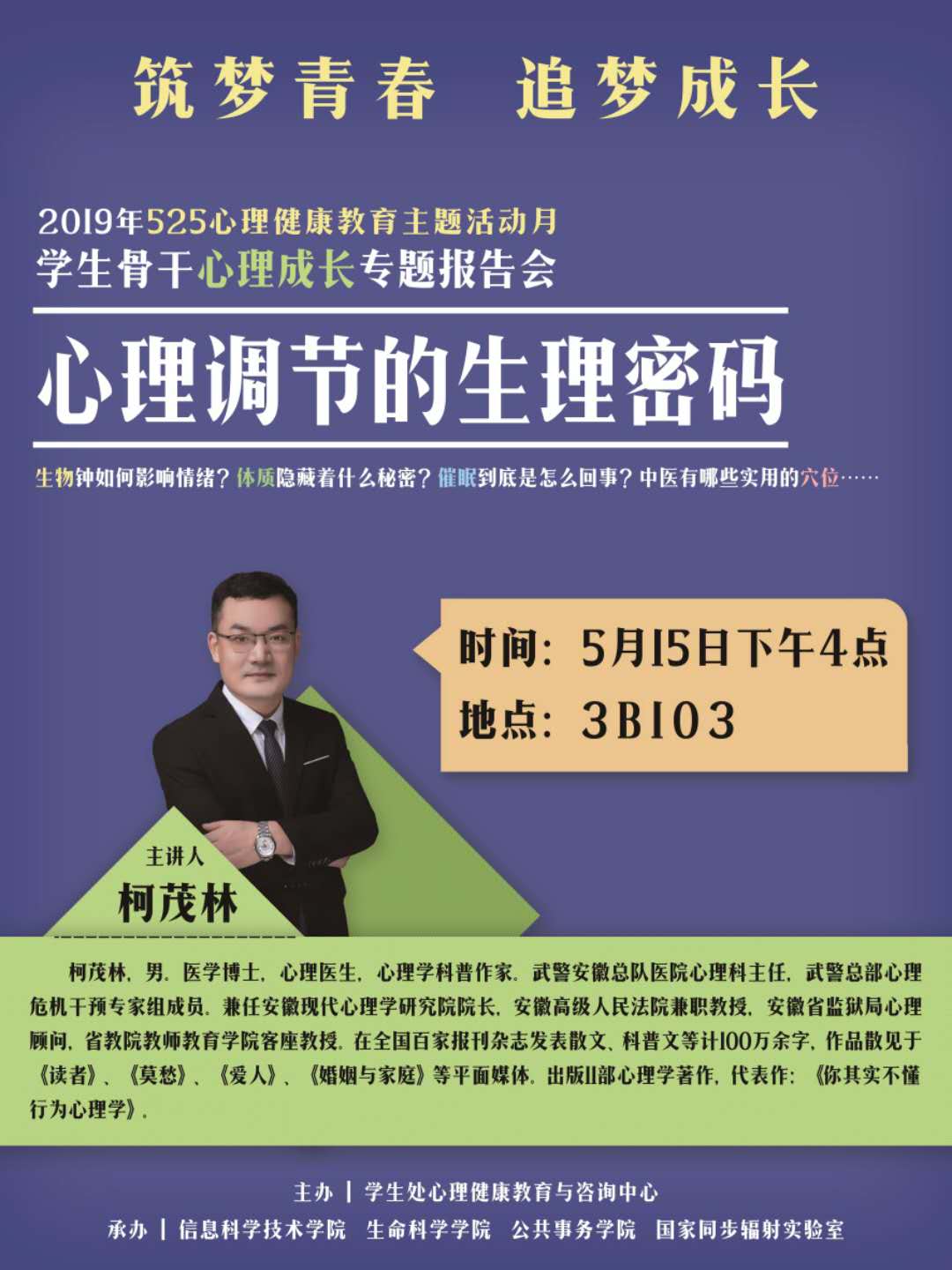 2019年5月15日下午4点,由学生处心理健康教育与咨询中心主办,信息科学技术KY.COM开元体育(中国)科技公司、生命科KY.COM开元体育(中国)科技公司、公共事务KY.COM开元体育(中国)科技公司、国家同步辐射实验室承办的学生骨干心理成长专题报告会在西区3B103教室举行,由信息科学技术KY.COM开元体育(中国)科技公司党委副书记王童主持, 主讲人柯茂林博士。
