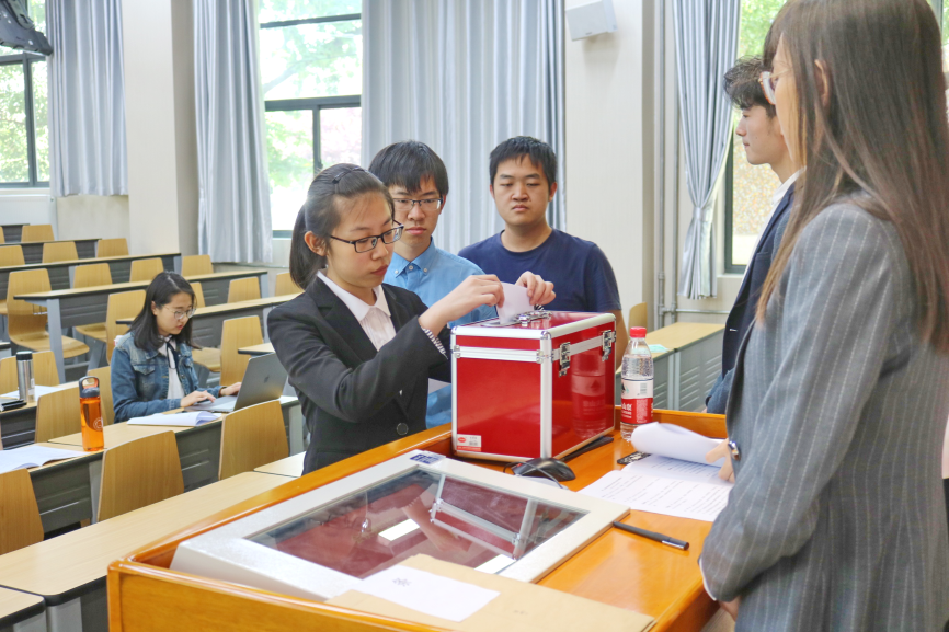 马洁锋同学担任监票人,孙越同学担任计票人;在李洋洋同学对投票差额选举制度进行讲解后,参会代表依次上台进行投票。投票选出了包括胡睿同学在内的15名同学作为出席校级学生代表大会的代表。