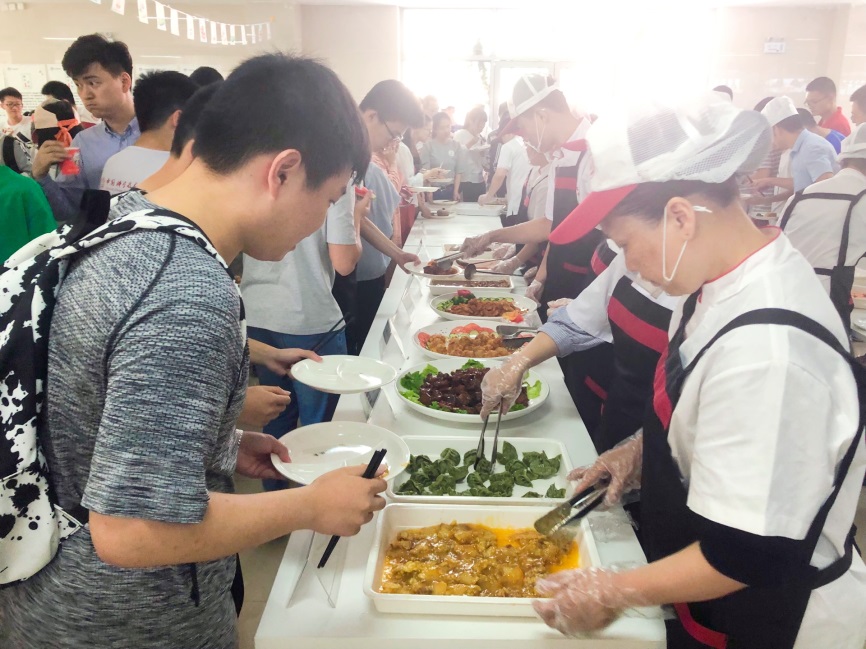2019年6月2日下午,1801班的同学们早早就在中区食堂一楼外聚集起来,等待活动开始。有的同学还特意没有吃午饭,想过来品尝盛宴呢!按照预先的分组,我班25位同学分成两组,分别由邱靖、孙雯带队,参加今天饮食服务集团“食堂邀你一起过端午”活动。