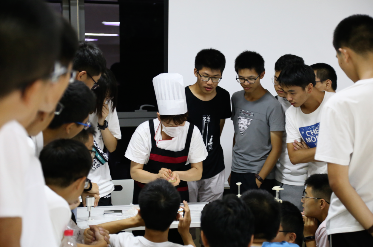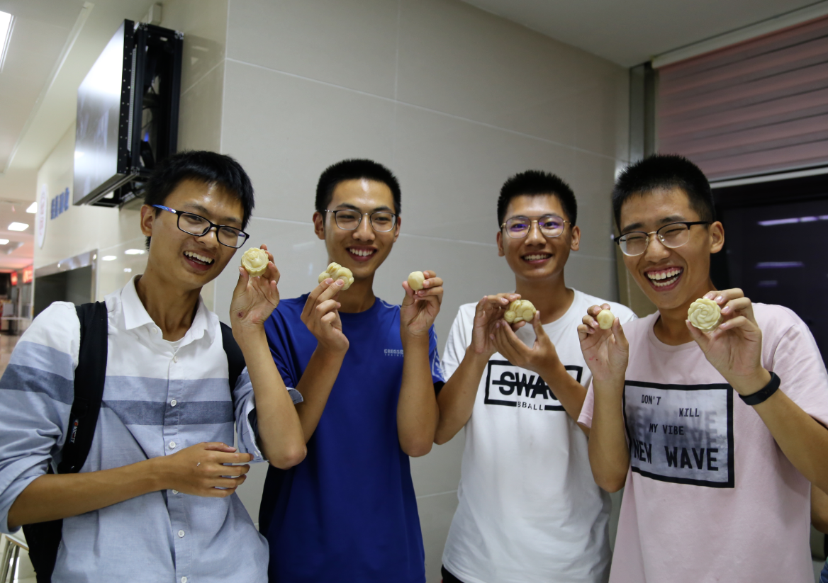 在阵阵欢声笑语之后,迎来了动手做月饼的环节。餐厅工作人员协助大家将现场布置好后,向同学们示范了月饼制作方法。随后同学们以宿舍为单位,开始亲自动手尝试。他们揉揉馅、擀擀皮、压个模,忙得不亦乐乎。最后,每个宿舍挑选出4个月饼称量,重量最接近标准重量的两个宿舍获得了班级精心准备的小奖品。