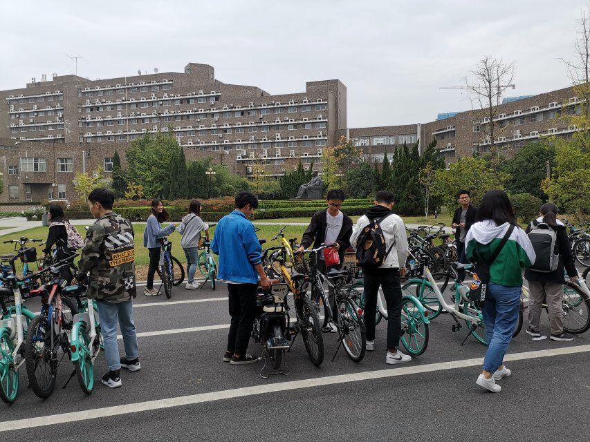 最后,大家来到了西区活动中心门口,将活动中心门口的单车摆放整齐。
