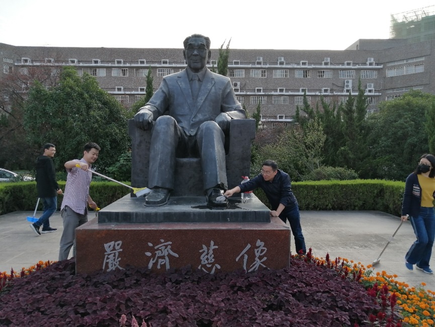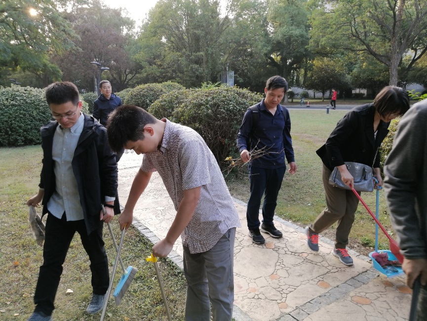 首先从各实验室借来了合适的清洁工具,包括扫把、抹布、水桶等,每位老师进行了任务分工,各司其职、相互配合,并对所要清理的区域和要求进行了详细的安排,接下来就开始了清洁工作。在一个多小时的劳动中,各位老师不怕脏、不怕累,积极发挥率先垂范作用,对西区的所有老科学家雕塑及周边环境进行清洁,最后对也西湖四周的垃圾也进行了收集。