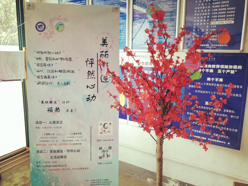“心愿漂流”子活动为期一周,从10月27日至11月2日,旨在为在校的同学们提供一对一的线上交流机会,促进男女同学之间的交流。该子活动分为两个阶段进行:第一阶段“心愿树上挂”,女生可以在心愿卡片上写下自己的心愿或者在情话卡片上写下土味情话,并匿名留下自己的联系方式将卡片挂在宿舍楼下的心愿树上;第二阶段“心愿我来取”,男生随机抽取心愿卡片帮该位女生实现心愿或者抽取自己心仪的情话卡片。