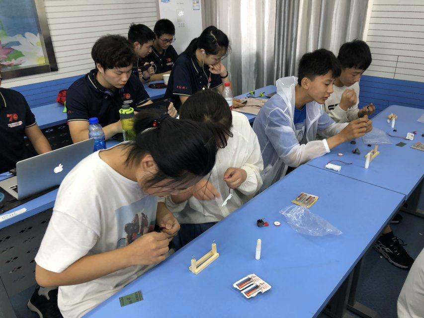 实践团明白“绝知此事要躬行”的道理,讲完这些对小孩子略显枯燥的理论后,立马安排了实验。综合趣味性和操作性,我们选取了“电动小线圈”和“水果电池”的实验。通电的密绕线圈在磁场下旋转起来,在柠檬上插上铜片和锌片就能让蓝色的LED灯亮起来。孩子们玩的不亦乐乎,但他们对这小小的能量却不满足,希望今后能进入USTC,去到科学岛,接触更大的能量——东方超环!
