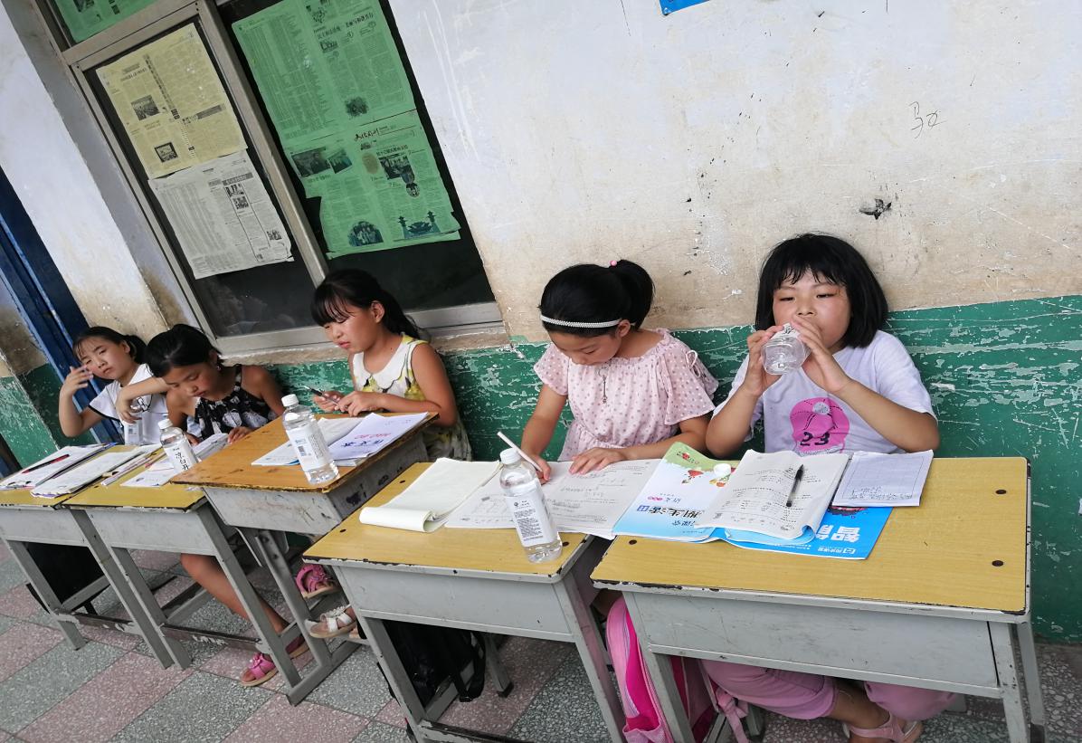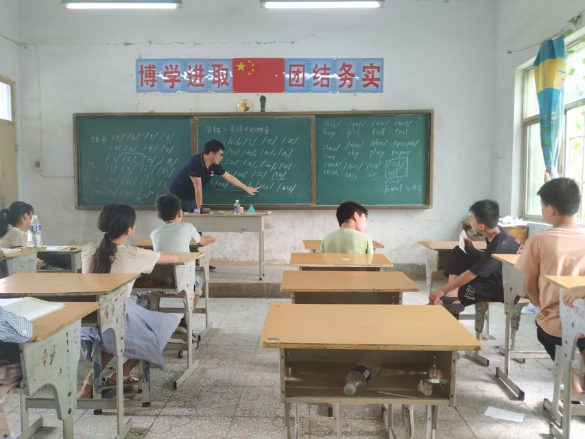 炙热的阳光无法阻挡孩子们的热情,孩子们吃过午饭便早早地来到教室,下午15:00整,第一节课开始,张鑫老师准备了他的硬核英语课,他为即将上初中的同学讲解英语中重要的音标。