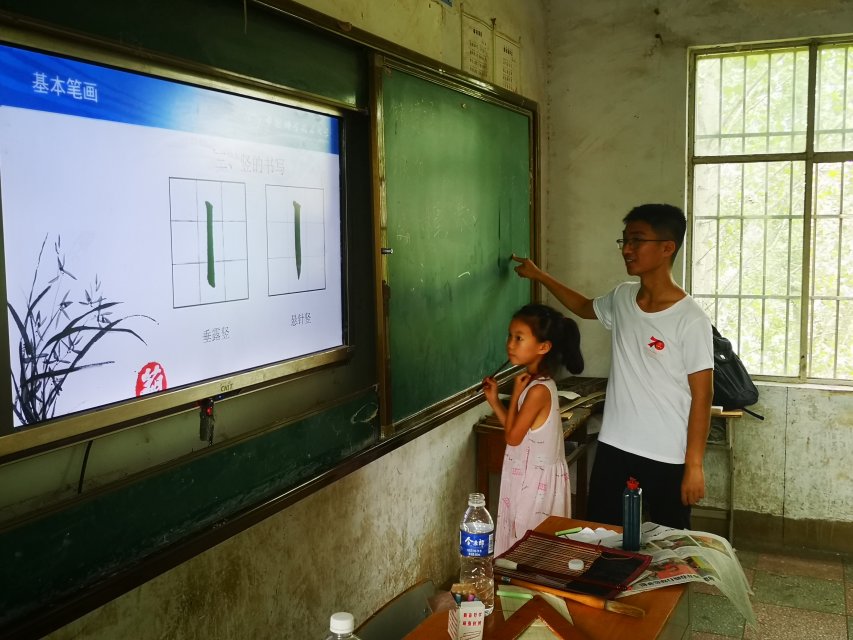 领会了文字的美妙之后,储博涵老师给一、二年级的小朋友们带来趣味书法课。从汉字最基本的笔画教起,并分别用粉笔和毛笔蘸水两种方式在黑板上演示笔法技巧,每讲完一种笔画也会请一些小朋友上讲台自己用毛笔尝试,他在旁边进行指导,这样的授课方式极大地激发了小朋友们对于书法的热情,以至于下课后小朋友纷纷跑上讲台抢着领毛笔在黑板上书写着稚嫩的汉字。