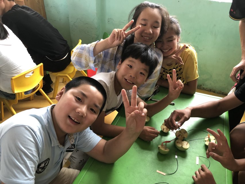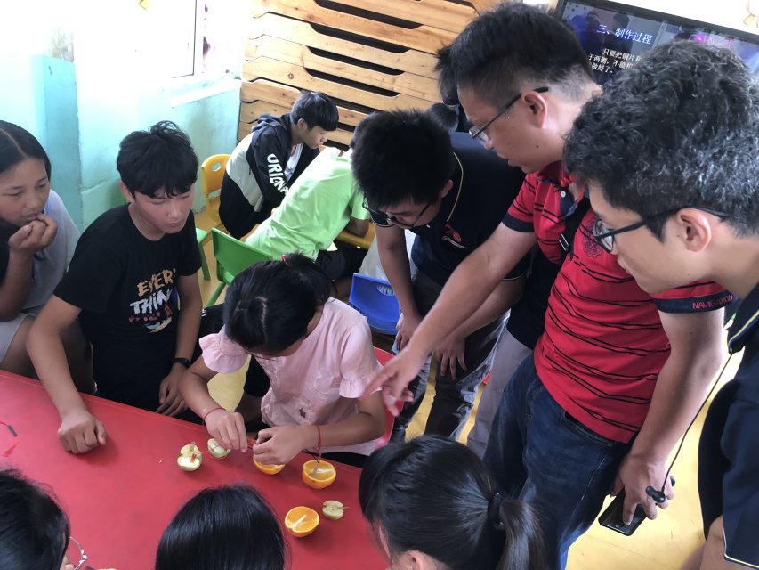 7月12日上午,我们先去到了村中的幼儿园,假期期间内幼儿园内会有一些小学生在那里补习。在村干部的介绍下,我们提前便与幼儿园的老师联系沟通妥当,老师对我们的到来表示欢迎,并十分乐意为我们的活动挪出时间。我们此行准备了一个水果电池的小实验,开始之前,麦华煜同学先给小学生们介绍了一下这个实验的相关背景和基础知识,引起了他们浓厚的兴趣。