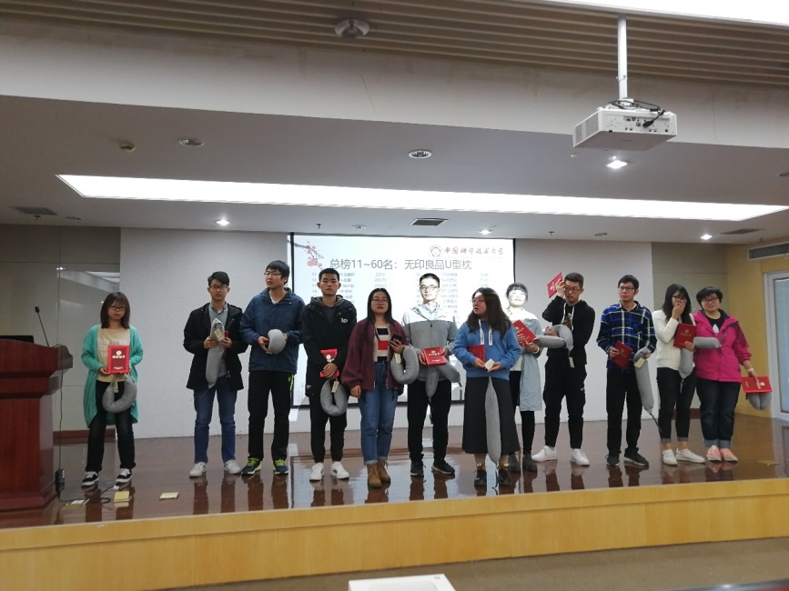 “闭幕式”于11月10日在西区科技西楼二楼会议室举办,分为三大部分:活动回顾、颁发奖品、活动总结。首先主持人播放活动视频,对一个月以来的活动进展状况进行简单的回顾;随后进入激动人心的颁奖环节,获奖者依次上台,由嘉宾颁发奖品并合影留念。
