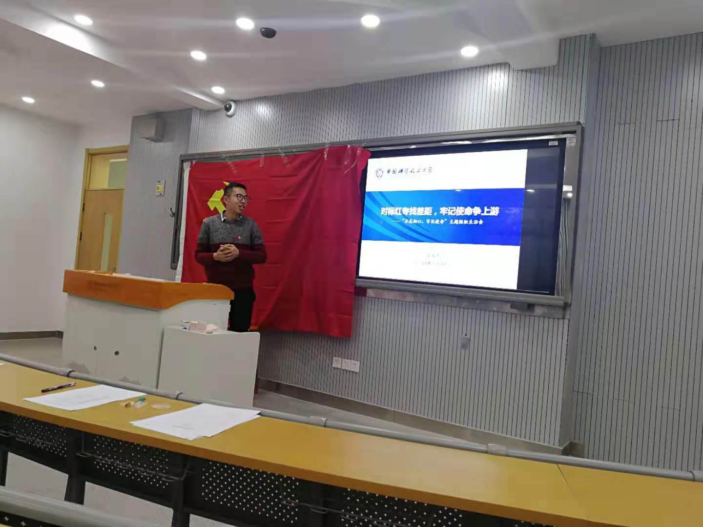 会议的最后,周老师作了点评,肯定了此次组织生活会准备充分、主题鲜明、批评环节敢于揭短亮丑,达到了较好效果。他指出,在今后的生活中,不断完善、不断发展,这就是为什么钱学森老先生要提出“红专并进”。对于支部同志们的不足,他说道,学习永远都在路上,没有尽头,红也没有尽头,专也没有尽头,不断地学习才是不二法门。学习是为了更好地建设祖国。他勉励同志们树立远大理想,踏实工作,在红专并进的道路上不断进步,牢记科教报国使命,不忘初心,力争上游,为实现中国梦不懈奋斗。