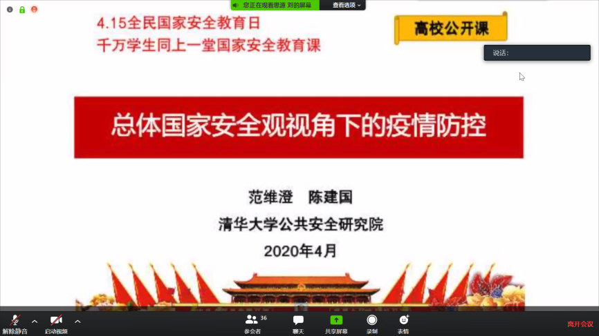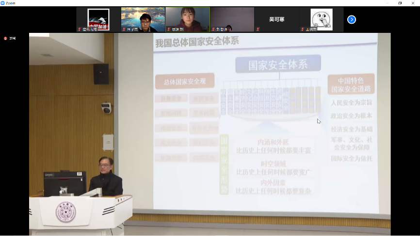 主持人刘思源同学接着播放了公共安全领域专家,清华大学范维澄院士讲授的关于总体国家安全观视角下疫情防控的一节公开课。院士逻辑清晰,深入浅出地剖析了总体国家安全观的基本要素和理论核心,将疫情防控作为生动的实践案例纳入到总体国家安全观这样一种高度抽象化且极具指导性的新理念的视域下。同学们纷纷在评论区表示,通过这堂课的学习,自己对国家安全的认识提升到了新高度、新境界,充分认识到了这一理论具有的前瞻性和指导性,并为党和国家在这一理论指导下的有力举措感到深深的感动和鼓舞。
