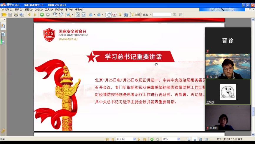 本次全民国家安全教育日宣传教育线上主题班会内容丰富详实,形式生动有趣,线索清晰简洁,带领同学们在总体国家安全观的高度重新认识国家安全,解读疫情防控中的中国成就,不仅巩固提高了同学们的国家安全意识,更坚定了同学们对战胜包括疫情在内的各种艰难险阻的必胜信心。“备豫不虞,为国常道”,同学们将坚定不移地坚持总体国家安全观,“增强忧患意识,做到居安思危”,为决胜全面建成小康社会贡献出自己的力量。