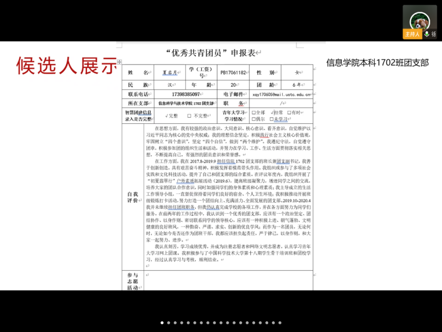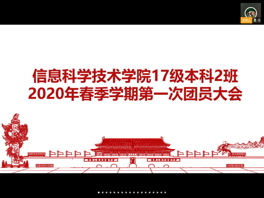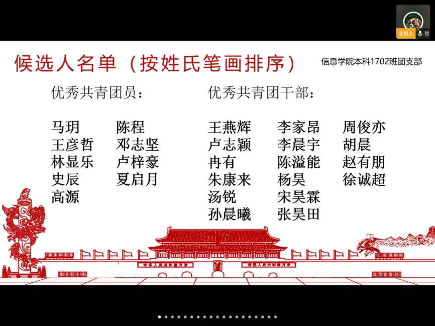 3月25日下午,信院本科1702班召开了春季学期第一次团员大会。由于新冠疫情的阻隔,这次会议利用视频会议软件,开展线上展示、发言、投票等环节。本次团员大会由团支书徐诚超主持,由团支部副书记汤锐负责组织。本次大会主要分为三项议程,一是选举产生“校优秀共青团员”、“校优秀共青团干部”;二是疫情防控工作志愿者事迹学习;最后是班主任周老师寄语。
