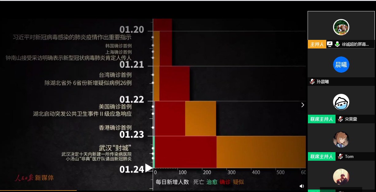前期,新冠病毒在肆虐传播扩张,日期也在有序紧凑地递增,在这冰冷地感染人数、死亡人数后面,全国人民面对疫情不畏惧,在大声为武汉人民喊加油。随后报道全国各地捐献物资,派遣一批又一批的医护人员前往一线支援武汉。然而我们有志愿者因劳累过度或因感染而牺牲了,在病情面前我们又显得那么无力,但火神山医院的出现,见证了中国速度,见证了全国人民齐心协力办大事的决心,为疫情的防控打下了坚实的基础。同学们在观看视频时深受感动,卢梓豪同学在视频会议聊天区中感慨道:“伟大的人民战争”。