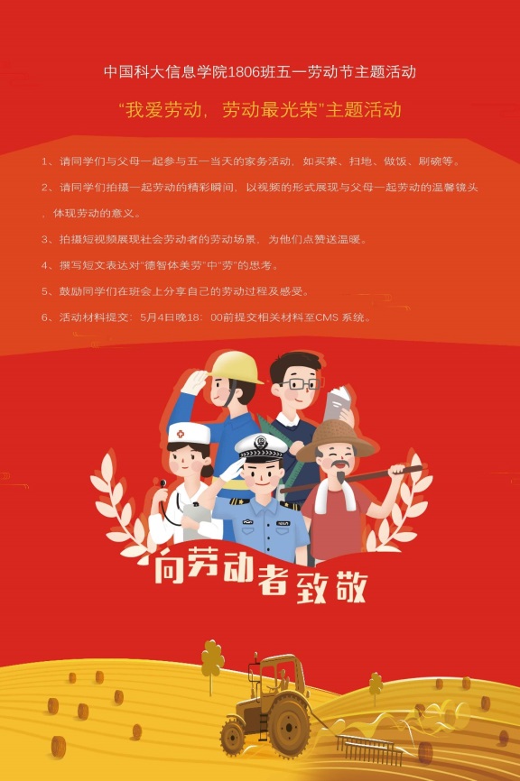 KY.COM开元体育(中国)科技公司本科1806班于2020年5月1日,举行了“我爱劳动,劳动最光荣”主题活动,活动包括与父母一同做家务、拍摄做家务的瞬间、为五一当天的劳动者们送上祝福等6种形式。活动旨在通过这6种形式,了解“劳动最光荣”的内涵,感受劳动者的辛劳。