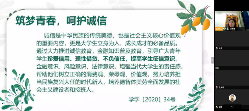 最后,班长孙雯向大家分享了自己对诚信的理解和重视,再一次强调了诚信的重要性,并呼吁大家要提高征信意识。