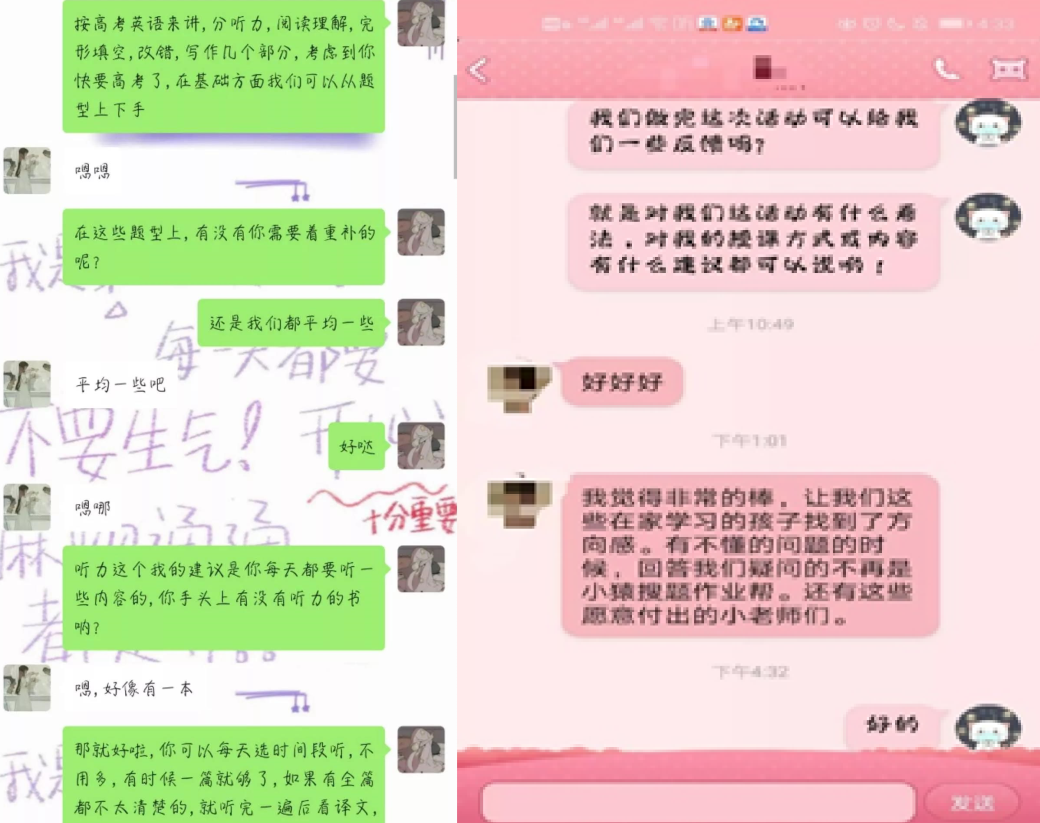 在辅导过程中,一方面,志愿者在线上收到问题后准确做答,并在此基础上拓展相关知识,以确保学生真正弄懂知识点,同时在辅导过程中,志愿者也将学习方法、考试技巧等内容加以传授,达到授之以渔的效果,另一方面,辅导学生也和大学生畅所欲谈,初高中生活上的经验,疑惑都会有交流,也会满足辅导学生对大学生活的好奇和向往,介绍大学的日常学习与生活,给他们树立生活学习上的信心和对未来的美好向往。