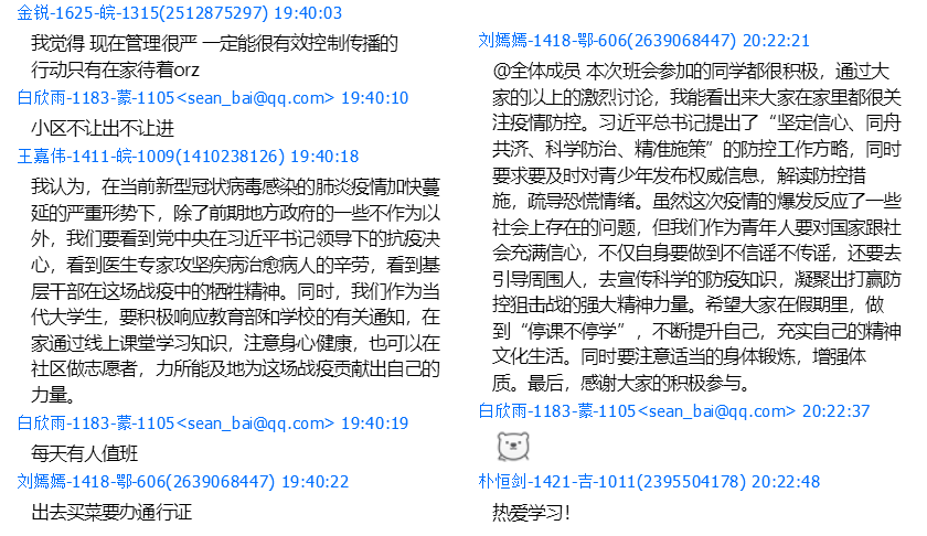 根据团组织安排,2020年2月12日晚,中国科学技术大学信息KY.COM开元体育(中国)科技公司本科2018级6班通过班级QQ群线上讨论的方式,开展了“青春战疫,共克时艰”线上主题班会。本次班会也是一次线上主题学习活动,深入学习习近平总书记关于疫情防控的重要讲话和一系列重要指示精神。本次班会由班主任王百宗与团支书刘嫣嫣同学主持,同学们根据阅读的相关推文,发表自己的心得体会。