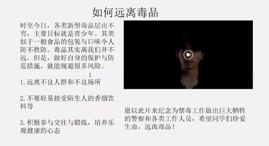 班会的第二部分,李小雨同学介绍了毒品的危害以及时刻对毒品——特别是新型毒品——保持戒备的重要性。近期,明星吸毒事件屡有发生,也提醒我们毒品其实离我们很近,我们要抵制诱惑,珍爱生命,远离毒品。最后,刘老师和同学们共同观看了禁毒宣传片。“花在毒品上的每一分钱,都是打在缉毒警察身上的一颗子弹”,远离毒品,既是对我们自己负责,更是对我们的家庭乃至整个社会负责。