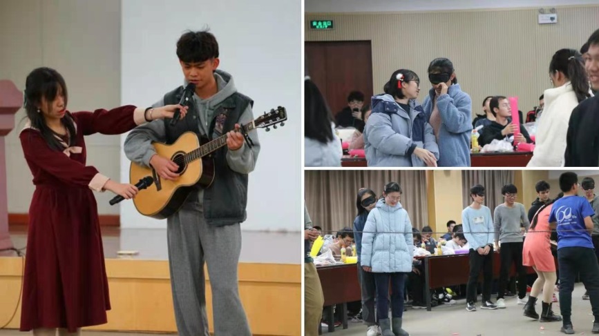 尹特尔同学表演了一首薛之谦的歌曲串烧,他深情地歌声绕梁三日,让同学们回想起了青春的美好与遗憾,在同学们平复心情后,最后的游戏“你是我的眼”开始了。同学们两两一组,一人蒙眼一人指引来跨过障碍,笑料百出的同时,也不乏温情。我想我们每个人都像是那些蒙着眼睛的同学一样,在黑暗中前行,所幸,我们的家长,老师,同学,朋友就像那些指引者一样,能在黑暗中给我们依靠,为我们指明道路。或许这正是这个游戏想真正告诉我们的。