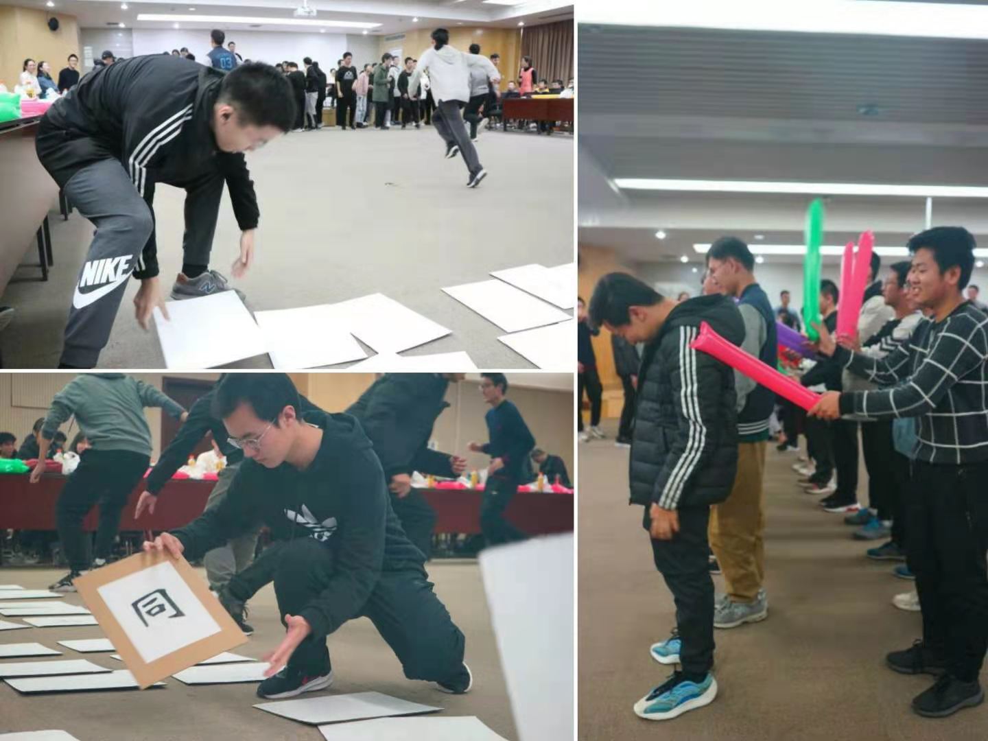 热身舞后,本次联欢会第一个游戏开始。在这个游戏中,同学们分为六组,每组九人,每人轮流翻开一张排列成九宫格的卡纸,最终拼出九个字的祝福词,并大声说出。最后一名接受惩罚。
