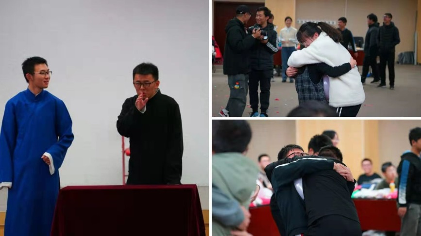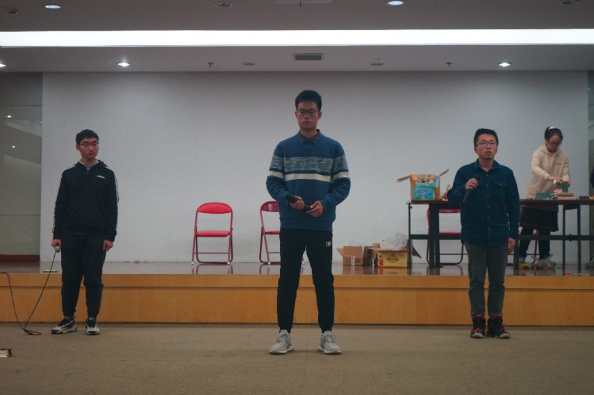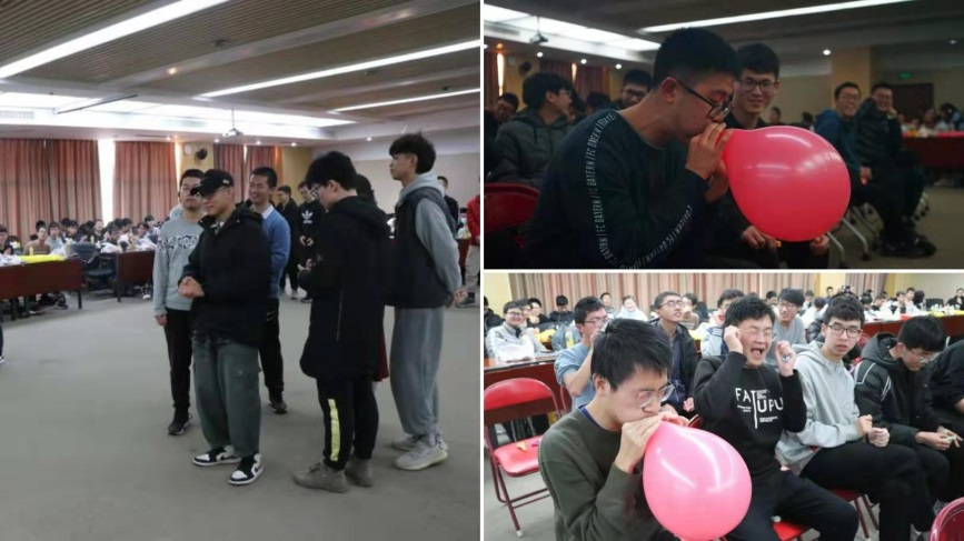 两位身怀绝技的同学表演了相声《打灯谜》,包袱不断,节奏适中,充分的调动了同学们的情绪,为随后的超级砰砰砰游戏作出了优秀的铺垫。该游戏是由两个人合作,在不许用手的前提下将气球挤爆,参与游戏的同学们“搂搂抱抱”,“勾肩搭背”,或轻松写意,或用尽全力,玩的不亦乐乎,观众们也观看的十分尽兴,将活动的气氛推向了高潮。
