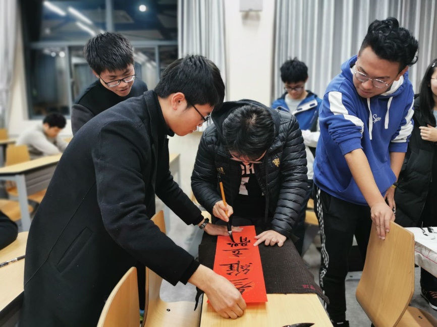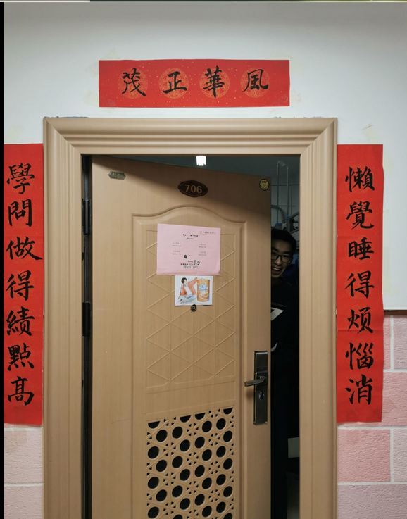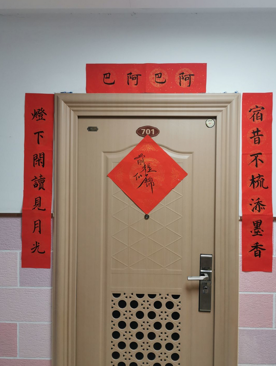 最后一个环节是写对联。以寝室为单位,完成一副对联的创作,然后将其张贴在寝室门口,以寄托美好的新年愿望。