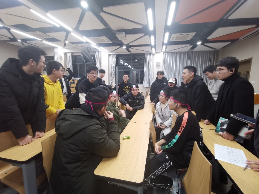 第二个环节是互动游戏“害你在心口难开”。全班同学被分成5个小组,每个小组都会有一个相应的主题,参加游戏的同学会得到一张写有与主题相关信息的卡片,但是他本人并不知晓,他需要通过询问组员问题来得到有关的信息进行推理,从而猜出自己卡片上的内容,每个组中前两名猜出来的同学为胜。 游戏过程中笑料频出,大家其乐融融。